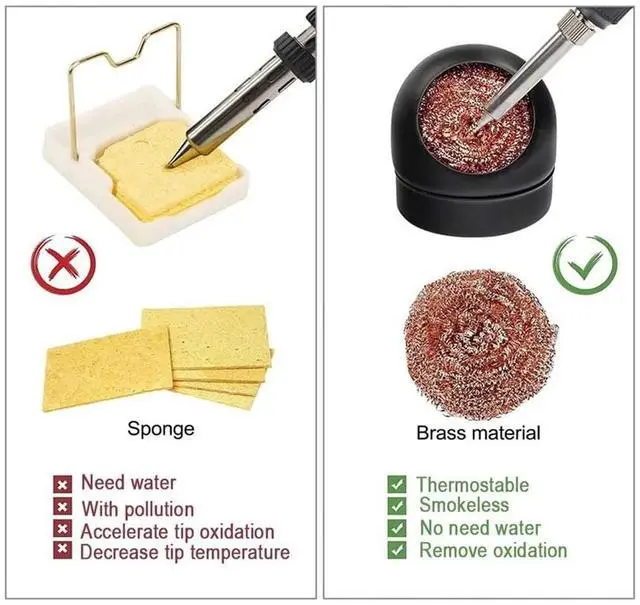 High-Quality MaterialsThe soldering iron tip cleaner holder is made of high-quality metal materials. The included metal cleaning balls provide 360-degree comprehensive cleaning of solder residues on the iron tip. Smokeless, non-toxic, sturdy, and durable, it is perfect for long-term use