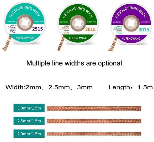 Desoldering Wick with Copper Braid - Solder wire3 pieces copper solder braid in 3 size, width 2.0mm/2.5mm/3.0mm, length 1.5m, 2 pieces for each size; geometrically-precise weave, can be used to clean the spare solder on the pin away to avoid short circuit, to meet your various of soldering needs.