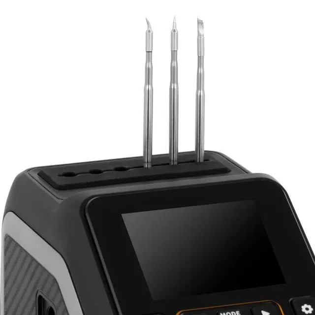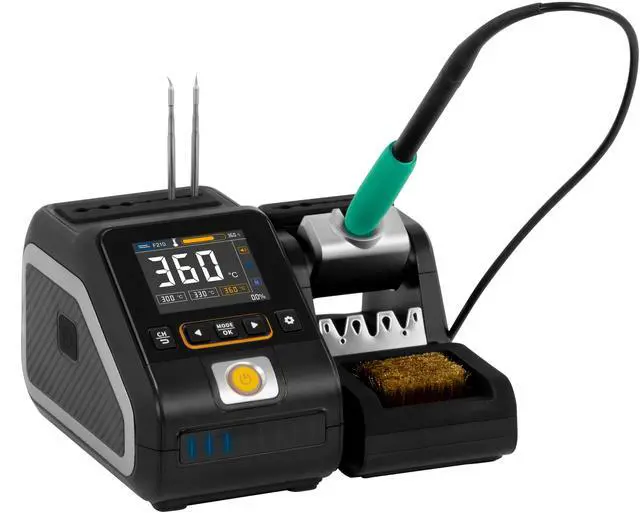 The integrated colour HD display offers a clear and concise representation of all relevant parameters, making operation particularly user-friendly. The Soldering iron / Soldering device is supplied with three interchangeable fine soldering tips, which are ideal for precise work and offer a wide range of applications. Two flexible arms, also known as "helping hands", facilitate the fixing of components and make work even more pleasant. The integrated metal rail allows the soldering tips to be changed quickly and easily, even during operation.
