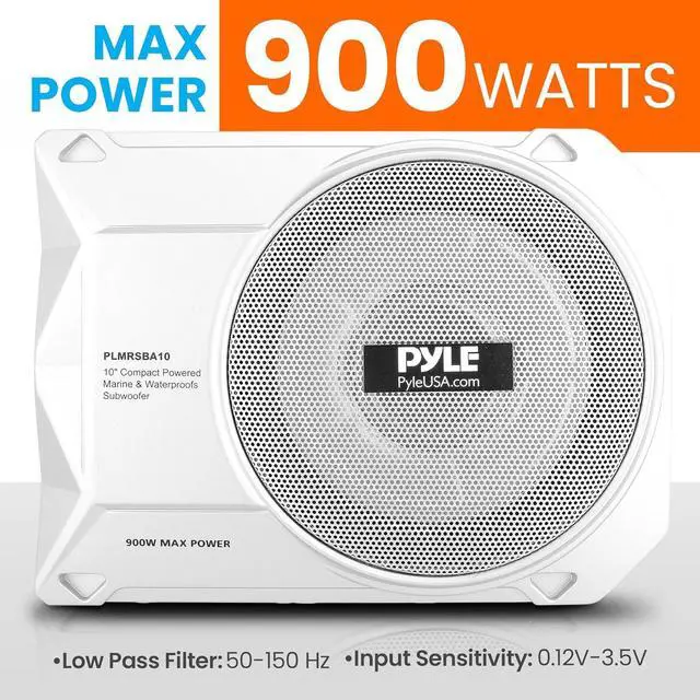 10-Inch Low-Profile Amplified Subwoofer System - 900 Watt Compact Enclosed Active Marine Underseat Car Subwoofer with Built in Amp, Powered Car Subwoofer w/Low & High Level Inputs - PLMRSBA10