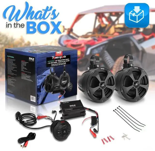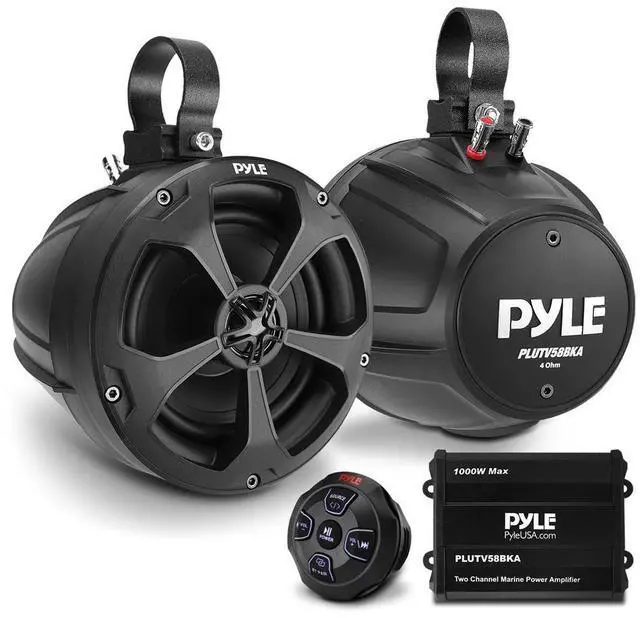 The Pyle PLUTV58BKA is a complete 5.25" waterproof marine speaker system with a 2-channel amplifier and wireless Bluetooth streaming capability, designed for use with ATV, UTV, 4x4, Jeep, and boat stereo systems. This system includes two 5.25" marine speakers with polypropylene cones and butyl rubber surrounds, delivering clear, dynamic sound with neodymium dome tweeters for crisp highs. The 1000W max power output ensures deep bass and full-range stereo sound. The system also features a built-in amplifier, wireless Bluetooth control, and full connectivity options, including RCA and aux inputs.