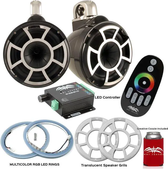 This bundle includes a pair of Wet Sounds REV10B-FC Revolution 10" EFG 4 ohm EFG HLCD Tower Speakers with Translucent Grills, a set of Wet Sounds LEDKITREV10-RGB RGB LED Speaker Light Rings and the Wet Sounds RF-RGB-MCV2 RF RGB LED music controller.