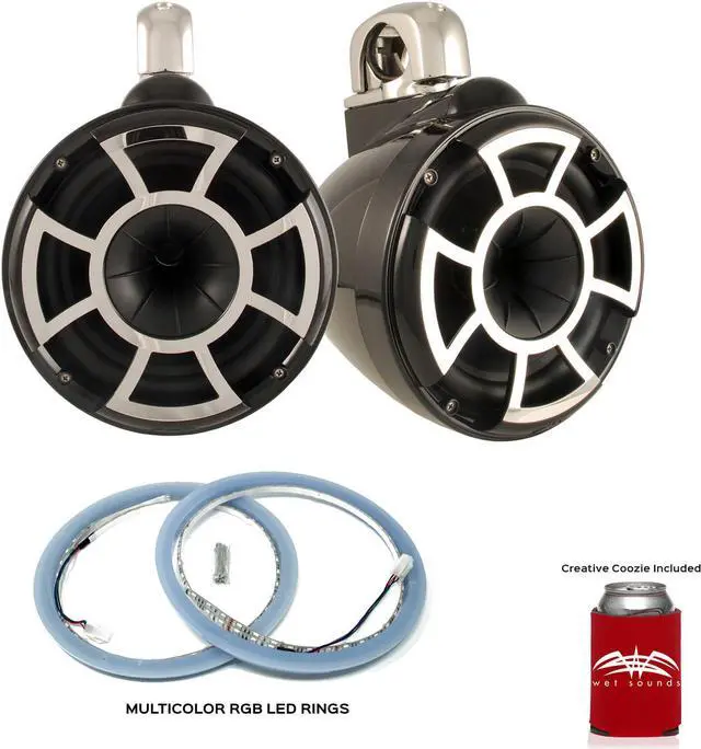 This bundle includes a pair of Wet Sounds REV10B-FC Revolution 10" EFG 4 ohm EFG HLCD Tower Speakers and a set of Wet Sounds LEDKITREV10-RGB RGB LED Speaker Light Rings.
