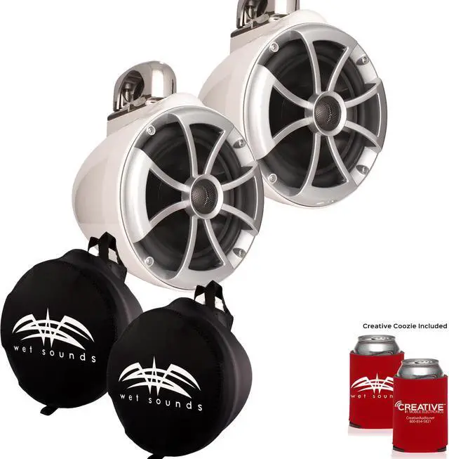 This bundle includes a pair of Wet Sounds ICON8-WFC ICON Series Wake Tower Speakers, and a pair of Wet Sounds Suitz8 Speaker Covers.
