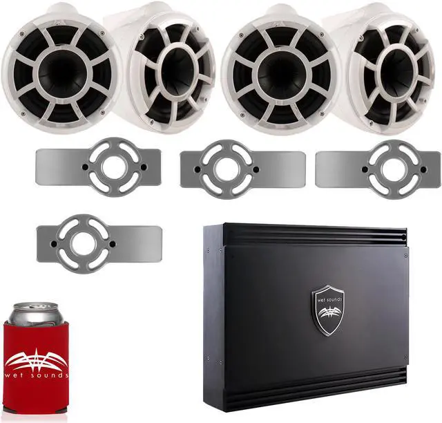 This bundle includes Two Pairs of Wet Sounds REV10 Revolution Series 10" EFG 4 ohm EFG HLCD Tower Speakers, two sets of Wet Sounds ADPMCBracket-11 Mastercraft Tower Adapters for 2007+ Mastercraft boats, and a Wet Sounds SD2 2-Channel 1250 Watt RMS Amplifier.