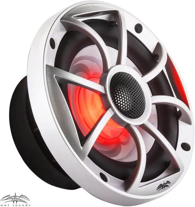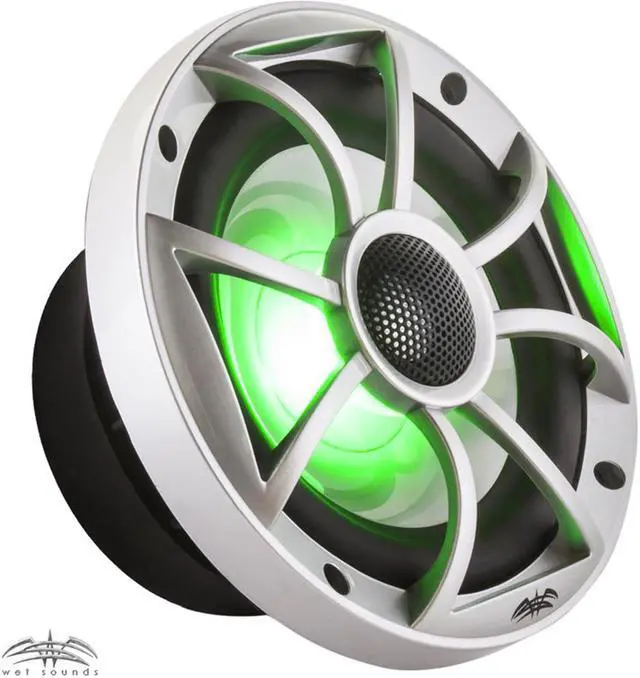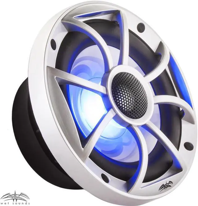 The XS-65i RGB is a 6.5 inch component style coaxial with integrated RGB LED in the tweeter protection cup. The tweeter protection cup is injection molded in our translucent material to provide a unique glow. The RGB led can be hooked up to 12 volts and a single color for red, blue or green or combined with our RGB LED controller for unlimited colors and ability to change colors, flash and fade all from the RF remote control. The XS-65i features a silver grille and silver injection molded composite cone with Wet Sounds proprietary rubber spider and surround, Nylas frame/grille. And Horn Flare ¾ inch aluminum tweeter and rubber magnet boot.