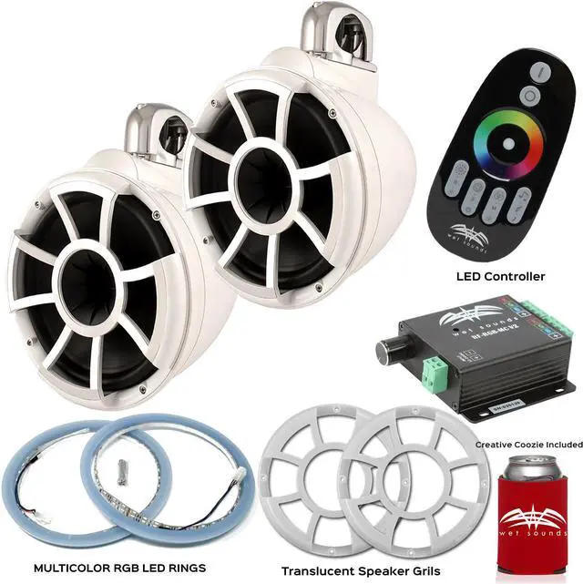 This bundle includes a pair of Wet Sounds REV10W-FC Revolution 10" EFG 4 ohm EFG HLCD Tower Speakers with Translucent Grills, a set of Wet Sounds LEDKITREV10-RGB RGB LED Speaker Light Rings and the Wet Sounds RF-RGB-MCV2 RF RGB LED music controller.