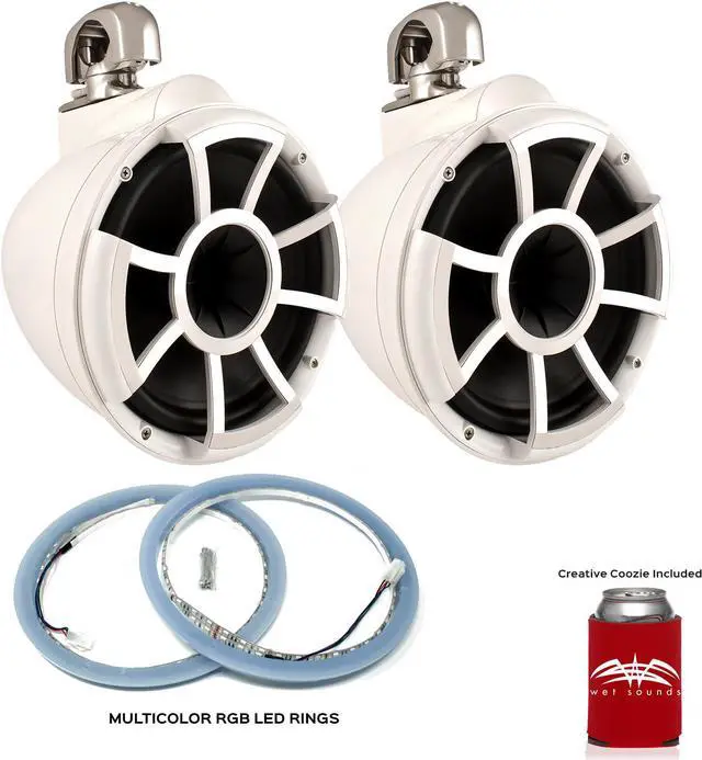 This bundle includes a pair of Wet Sounds REV10W-SC Revolution 10" EFG 4 ohm EFG HLCD Tower Speakers and a set of Wet Sounds LEDKITREV10-RGB RGB LED Speaker Rings