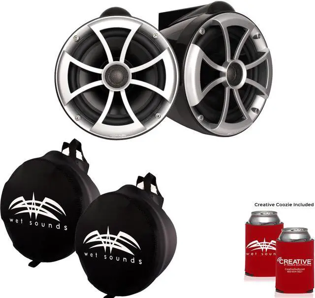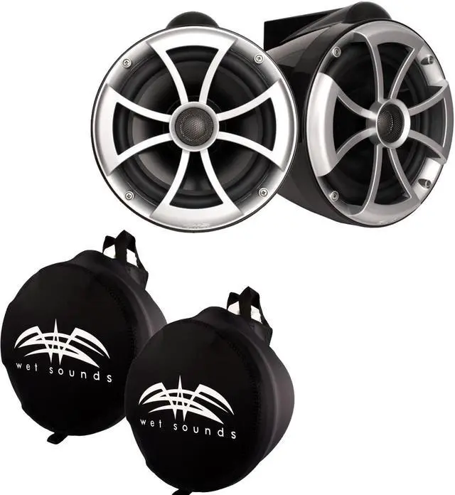 This bundle includes a pair of Wet Sounds ICON8-BX ICON Series Wake Tower Speakers, and a pair of Wet Sounds Suitz8 Speaker Covers.