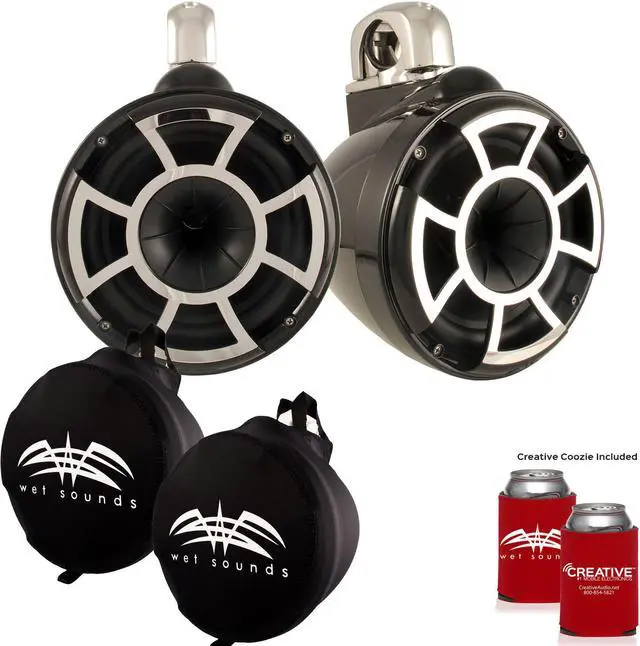 This bundle includes a pair of Wet Sounds REV10B-FC Revolution 10" EFG 4 ohm EFG HLCD Tower Speakers and a set of Wet Sounds Suitz 10" Speaker Covers.