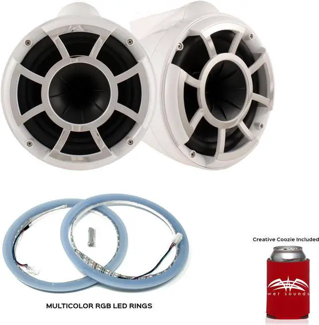 This bundle includes a pair of Wet Sounds REV10W-X Revolution 10" EFG 4 ohm EFG HLCD Tower Speakers and a set of Wet Sounds LEDKITREV10-RGB RGB LED Speaker Rings