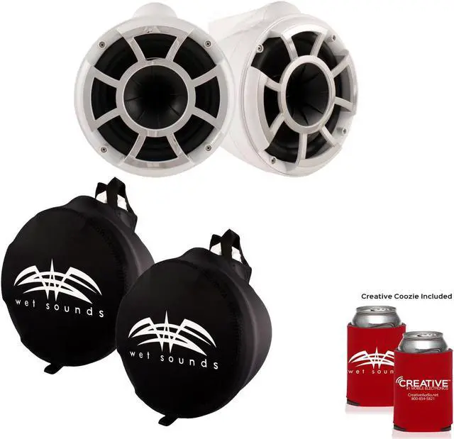 This bundle includes a pair of Wet Sounds REV8W-X Revolution 8" EFG 4 ohm EFG HLCD Tower Speakers and a set of Wet Sounds Suitz 8" Speaker Covers