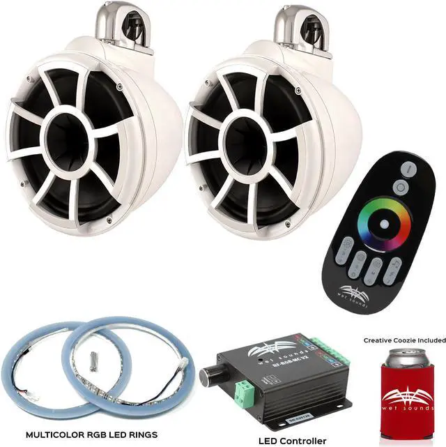 This bundle includes a pair of Wet Sounds REV10W-FC Revolution 10" EFG 4 ohm EFG HLCD Tower Speakers, a set of Wet Sounds LEDKITREV10-RGB RGB LED Speaker Light Rings and the Wet Sounds RF-RGB-MCV2 RF RGB LED music controller.