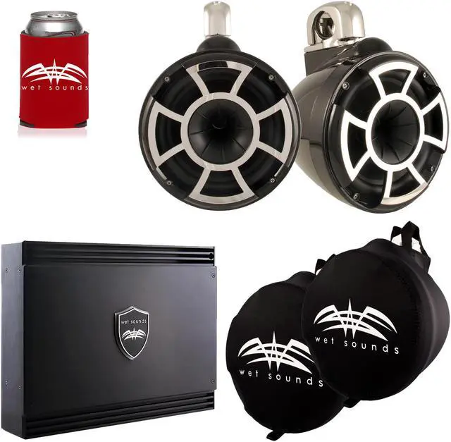 This bundle includes a pair of Wet Sounds REV10B-FC Revolution 10" EFG 4 ohm EFG HLCD Tower Speakers, a pair of Wet Sounds Suitz10 Speaker Covers, and a SD2 Sinister Series 2-Channel 1250 watt amplifier.