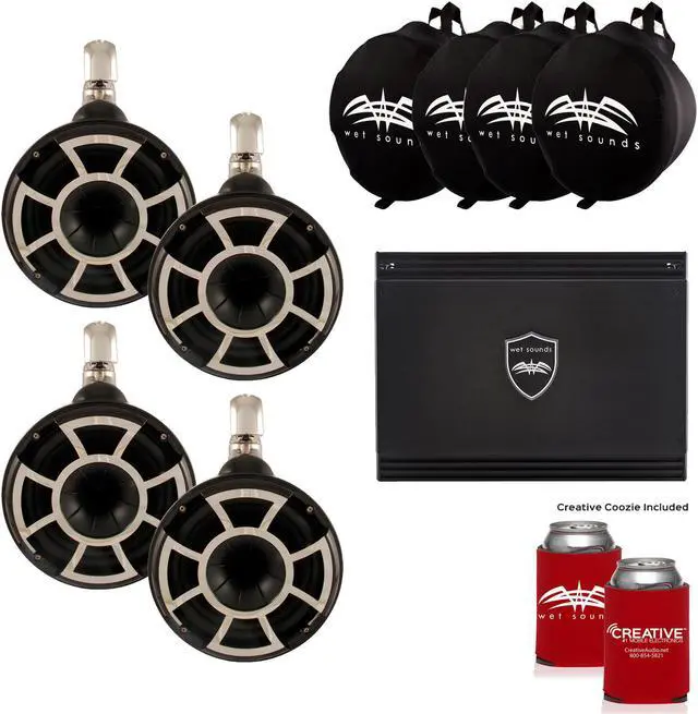 This bundle includes Two Pairs of Wet Sounds REV10B-FC Revolution 10" EFG 4 ohm EFG HLCD Tower Speakers, Two Pairs of Wet Sounds Suitz 10" Speaker Covers, and a SD2 Sinister Series 2-Channel amplifier.