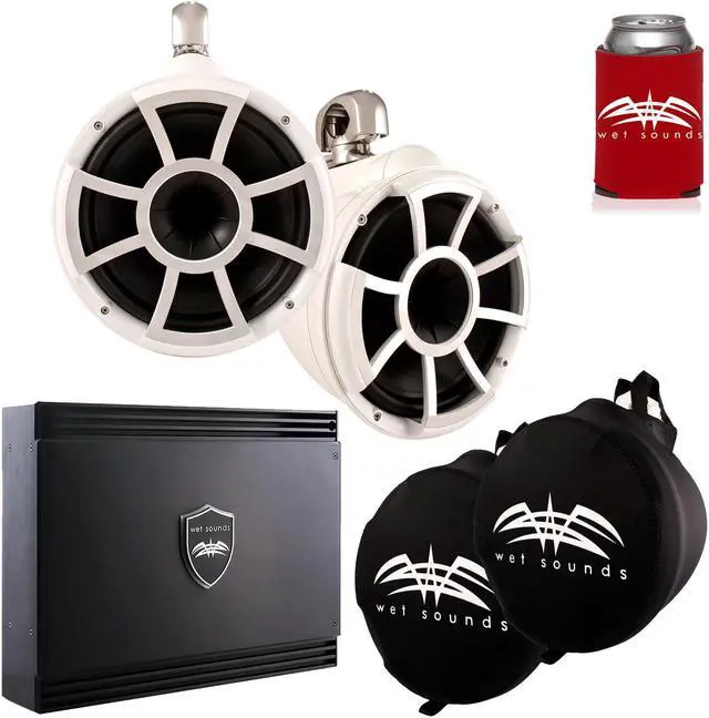 This bundle includes a pair of Wet Sounds REV10W-SC Revolution 10" EFG 4 ohm EFG HLCD Tower Speakers, a pair of Wet Sounds Suitz10 Speaker Covers, and a SD2 Sinister Series 2-Channel 1250 watt amplifier.