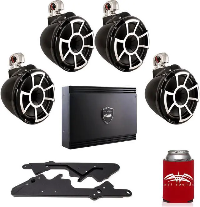 This bundle includes two pairs of black Wet Sounds REV10 10" Swivel-Clamp tower speakers, a Wet Sounds SD2 Amplifier & adapters for dual tower speakers on Malibu G3 Towers