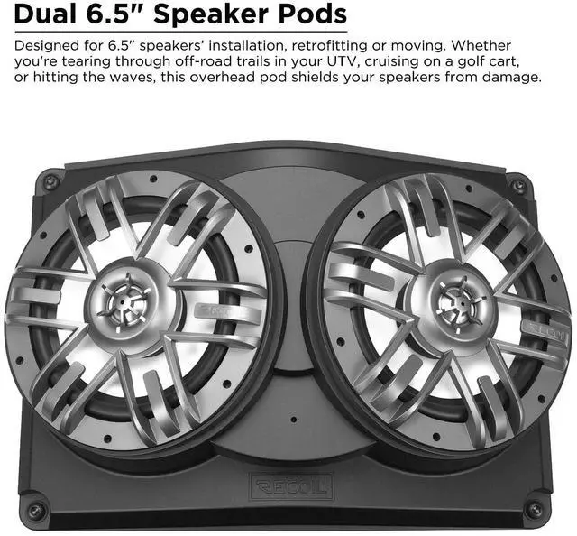 universal dual 6.5 speaker pods are for speakers installation, retrofitting or moving. Whether you're tearing through off-road trails in your UTV, cruising on a golf cart, or hitting the waves, this overhead pod shields your speakers from damage while maintaining crystal-clear sound.
