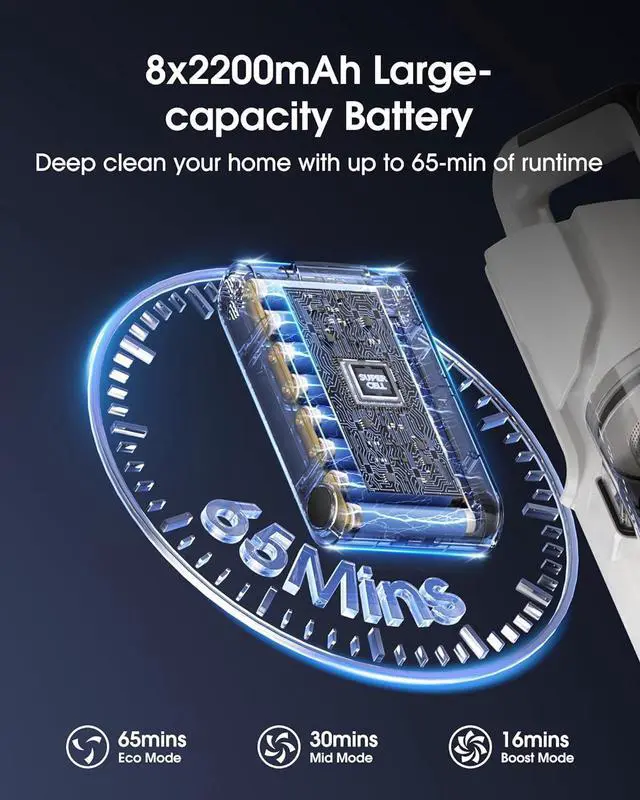 Extended Runtime for Big Jobs With fast charging, it fully recharges in ONLY 2.5 hoursCharger Included. Its upgraded 176, 000mAh 8-cell battery delivers up to 65 minutes of continuous cleaning in ECO mode, reducing mid-task interruptions so you can cover more ground with fewer breaks.
