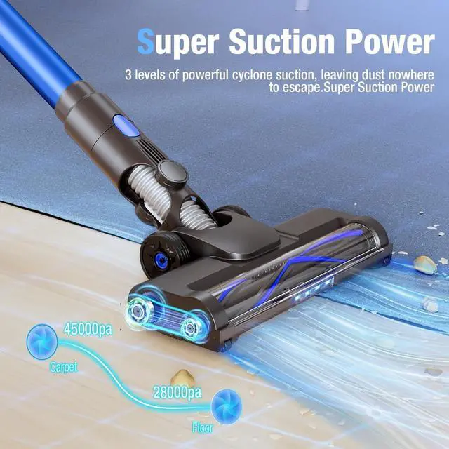 HURRICANE-FORCE SUCTIONThis cordless vacuum cleaners for home features a 2025 upgraded 550W motor, delivering a powerful 45Kpa hurricane suction to effortlessly handle both daily and deep cleaning tasks. Equipped with a noise-reducing sponge, it operates at a noise level of <75dB, even at the highest setting, ensuring a quiet and comfortable cleaning experience for you and your family. With 3 adjustable modes, it easily tackles dust, debris, pet hair, and other messes on hard floors, carpets, or tiles, meeting the comprehensive cleaning needs of various surfaces and scenarios. Make household chores more efficient and cleaning more worry-free!