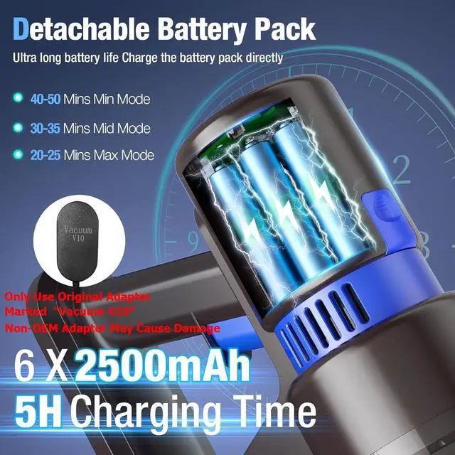 IMPORTANT NOTETo ensure the best charging performance and safeguard your battery, its crucial to exclusively use the original adapter, identifiable by the words Vacuum V10 and fully charge before each use. It is equipped with an anti-tangle protection feature. If an excessive amount of hair becomes entangled around the roller brush, the device will automatically shut down to utill the tangled hair has been removed. Do not let the debris exceed the 2/3 full mark. Overfilling the dust cup can impede airflow, which will significantly reduce suction performance. In severe cases, it may cause debris to be drawn into the motor and expelled from the side vents.