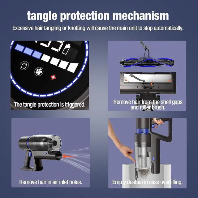 ERGONOMIC DESIGNThis handheld vacuum features an innovative V-shaped roller brush and comb design to guide hair smoothly into the air duct, reducing tangling. The flexible swivel head rotates 0° to 180° sideways and 0° to 90° up and down, effortlessly reaching under furniture and into corners. Front LED lights illuminate the cleaning path, revealing hidden dust and debris. With a modular design, detachable components ensure easy cleaning and maintenance, saving time and effort. The self-standing design allows for hands-free relaxation whenever cleaning fatigue sets in.