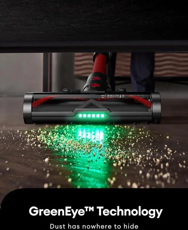 Green Laser TechnologyThe roller brush incorporates green light technology to reveal dust that' s normally hard to see. This feature enhances cleaning precision, especially in low-light environments. Perfect for thorough cleaning under furniture and in corners, this cordless vacuum ensures no dirt goes unnoticed.
