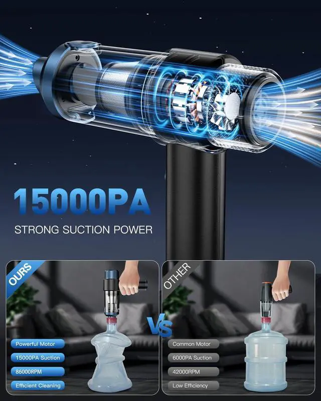 Powerful 15000PA SuctionPowerful motor of the hand held vacuum cleaner has 86, 000RPM and provides up to 15000PA of suction power. Whether it' s a sofa or carpet in your home, or the interior of your car, it' s easy to clean. The rapid heat dissipation function can expel heat in a short period, making the motor more durable and long-lasting. The operating sound is as low as 40dB, so you can clean quietly without disturbing others