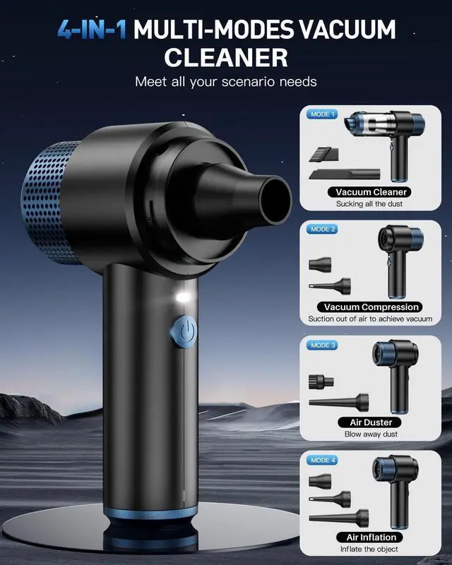 4-IN-1 Car Vacuum CleanerHandheld Vacuum cleaner used with 7 accessories can be used to get 4 modes of suction, blowing, inflation and vacuum compression to meet your different use scenarios. Floor brush and nozzle brush can easily suck up all kinds of debris. Blowing nozzle can be used to blow away dust from keyboards and narrow crevices. Two sizes of universal nozzles can quickly inflate or expel air from objects such as swimming rings, mattresses, etc