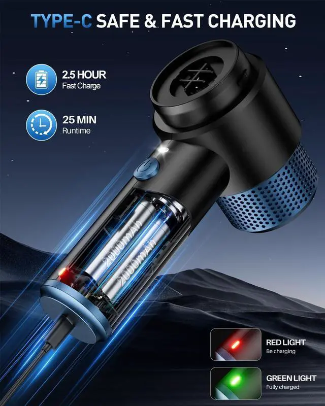 Type-C Fast & Safe ChargingPortable car vacuum cleaner has a built-in 4000mAh battery that can be recharged and used repeatedly, which is more environmentally and energy efficient. Quickly charge mini car vacuum cleaner using the USB port of your computer, mobile power, car charger, etc. You can also use the 5V/2A adapter to fully charge it in 2.5 hours (red light for charging, green light for fully charged) with 25min of run time
