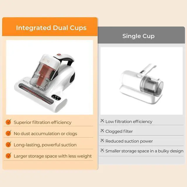 High Efficiency HEPA FiltrationOur mattress vacuum cleaner with premium HEPA filter that deeply purifies and releases fresh air, captures 99.9 % of particles as small as 0.3 microns, separate dust and hair without any leaks, ensuring clean air output and block the twice pollution effectively. Original integrated upper and lower dual-cup structure, patented dual cyclone filtration tech, for deep cleaning mattresses and sofas, bedding, carpets more efficient, achieves optimal results.