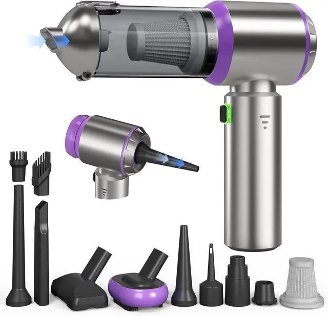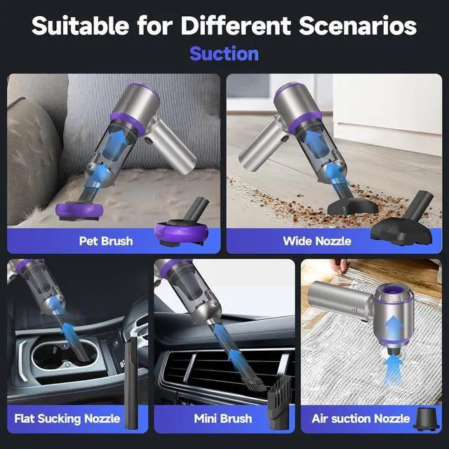 Multi-functional Accessories for Comprehensive CleaningThe cordless car vacuum set includes 10 tools including a soft brush (for dashboard), a hard brush (for cleaning tire grooves), an extended flat nozzle (for penetrating seat gaps), and a multi-functional two-in-one suction head (suitable for dry debris and light moisture) that can be used for vacuuming, blowing, inflating, and compressing to meet the needs of multiple scenarios in cars, homes, and offices
