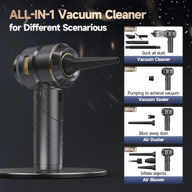 Practical Accessories for Various Cleaning TasksThis handheld vacuum cordless vacuum cleaner for home integrates four practical functions: vacuuming, blowing, inflating, and compressing, and vacuum includes 10 specialized nozzles to meet your different daily needs. Suction accessory kit including extension hose can be used with the suction nozzle and brush attachment and is easy to bend and stretch for cleaning any corner. The inflatable accessory set includes a variety of Nozzles, you can quickly inflate the swimming ring and kayak, and you can also help with outdoor barbecues.