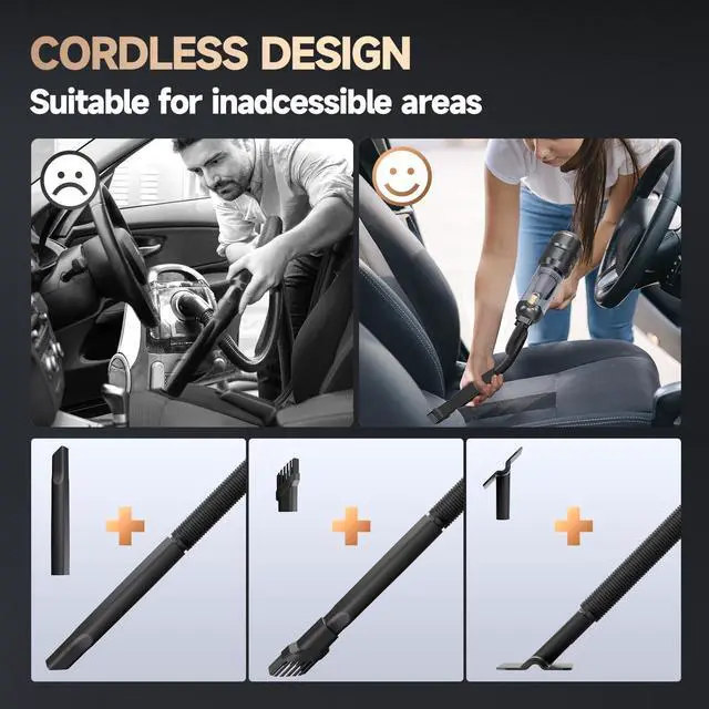 22000PA Strong SuctionThis rechargeable car vacuum portable cordless uses an upgraded high-speed brushless motor with 22000PA super suction. The 3-speed suction adjustment achieves different suction powers of 8KPA-15KPA-22KPA. This small handheld vacuum cleaner allows you to clean crumbs, dust, pet hair and sand hidden in the car seat or sofa.