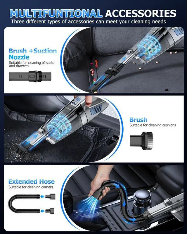 • MULTIFUNCTIONAL ACCESSORIESThe hand held vacuum cordless comes with 3 cleaning attachments to meet your cleaning needs. This suction nozzle with attached brush , making it ideal for cleaning dust from surfaces like seat cushions, flannel sections of foot mats, and air conditioning vents. The brush is suitable for cleaning dust on surfaces such as floor mats and keyboards. The extension tube can be paired with other accessories to clean hard-to-reach corners