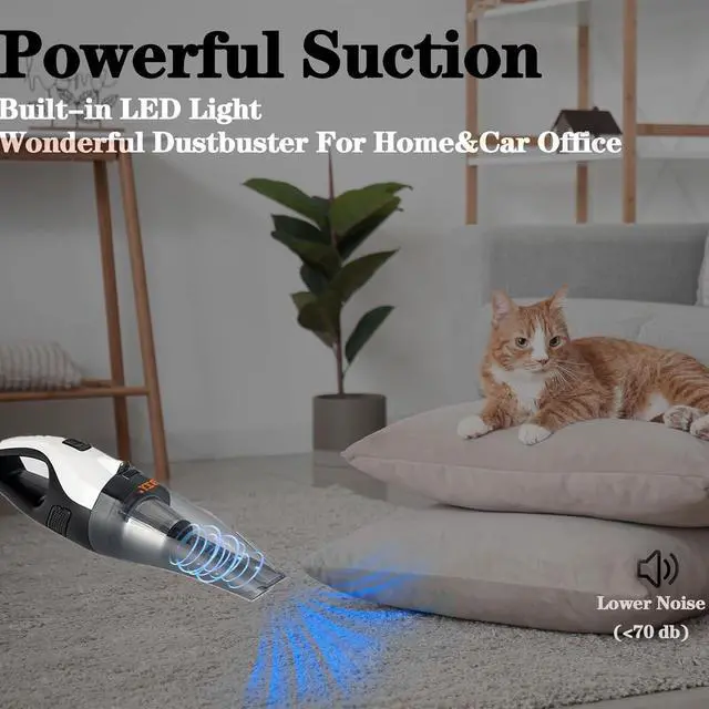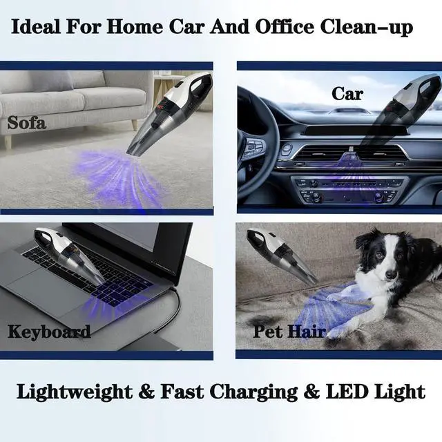 Ultra Car Cleaner & LED LightExperience car vacuum portable cordless perfection with 17.5KP a suction to help you deal with a variety of dirt such as small debris, pet hair, food residue and dust. The built-in LED light transforms this portable vacuum for car into a night-cleaning hero, you can easy to clean in dark areas.