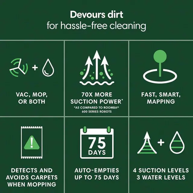 UP TO 75 DAYS HANDS-FREE CLEANING. Dirt and dust stay gone because it empties into the AutoEmpty dock with a bag that traps 99% of allergens as small as 0.7 microns. That means no mess or cloud of dust when you empty it. Just drop the used bag into the trash and put a new one in the base.