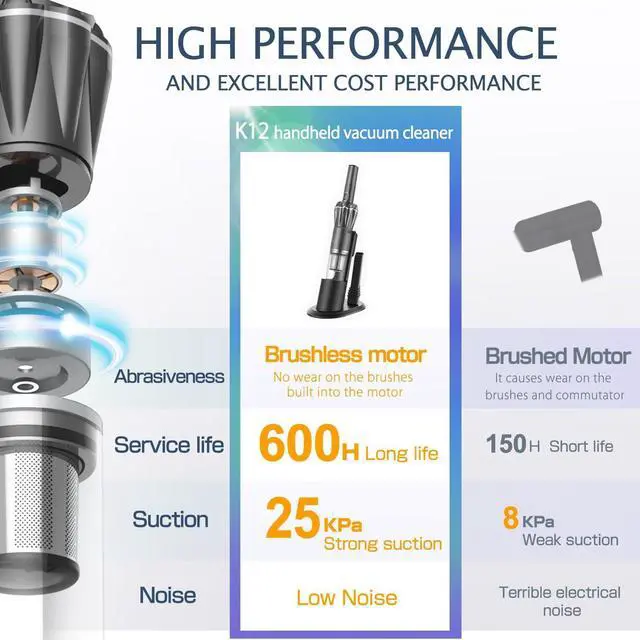 Advanced Powerful Brushless Motor The 2025 most advanced brushless technology greatly reduced friction when the motor is running and provides powerful suction, which beats most handheld vacuums on the market. Besides, the motor features super-long service life exceeds 500hrs which is two times longer than ordinary brushed motors 150-200hrs. Allow this powerful cordless handheld vacuum makes your life easier