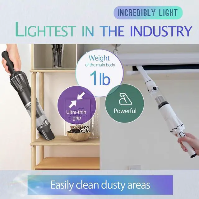 1 Pounds Super Lightweight & Portable Mini Size & Elegant Grey Decent Outlook The handheld vacuum is small and weights only 1pounds, which can be hold in hand and use with ease. Its perfect for cleaning dust in corner, cupboard, drawer and small gaps in cars. The color and shape design is eye-pleasing no matter keep it on desk or in cars.