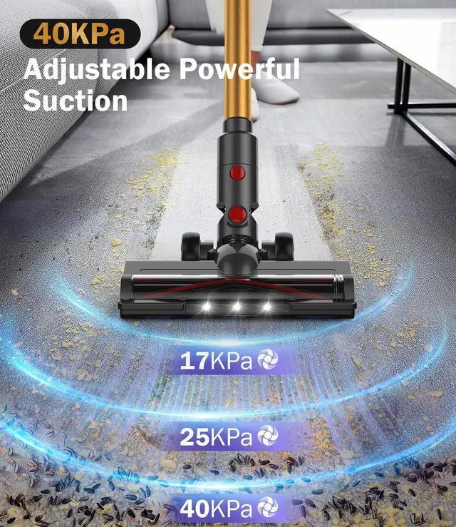 Latest 40Kpa Powerful SuctionNatorgix cordless vacuum cleaner is equipped with 2025 upgraded powerful 450W motor supply up to 40Kpa suction. And it can easily switch between 3 adjustable suction modes on various surfaces, effectively removing dirt, pet hair and debris on carpets, hardwood floors and furniture. You can also turn on the LED headlight to thoroughly clean the hidden dust under the furniture.