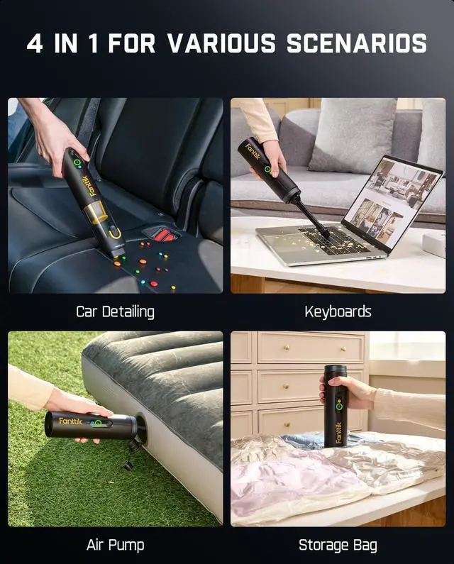4-in-1 Multi-Function Vacuum: Combines vacuuming, blowing, inflating, and deflating for versatile use. Handles car seats, keyboard debris, vacuum-sealing bags, and yoga mat inflation with ease