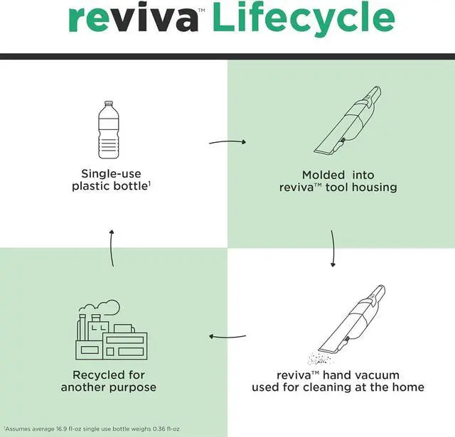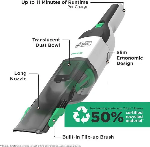 Tool housing made from recycled materials**: for the eco-conscious consumer, the Reviva dustbuster cordless hand vacuum' s tool housing is made with tritan renew 50% certified recycled material***