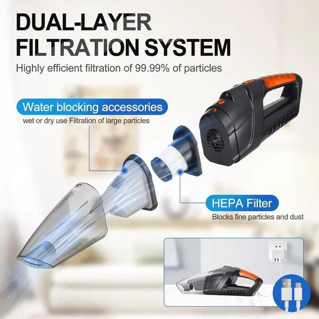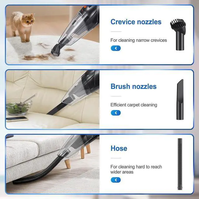 Wet and dry Cleaning: This portable vacuum can handle both wet and dry messes, great for dealing with kids' after-dinner crumbs, this portable vacuum cordless can also help you with pet hair and litter on sofas and floor stalls.