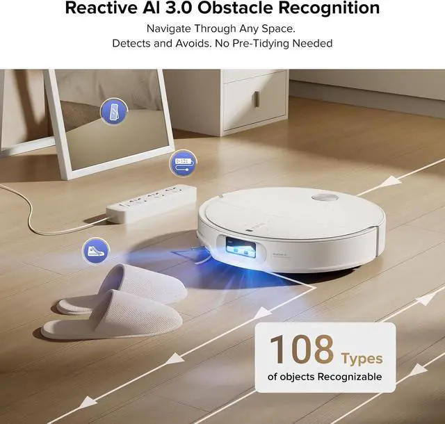 Reactive AI Obstacle Recognition: With structured light and an RGB camera, the robot intelligently detects and avoids 108 types of objects, seamlessly navigating around obstacles in both well-lit and dark spacesno need to clear your floor beforehand.