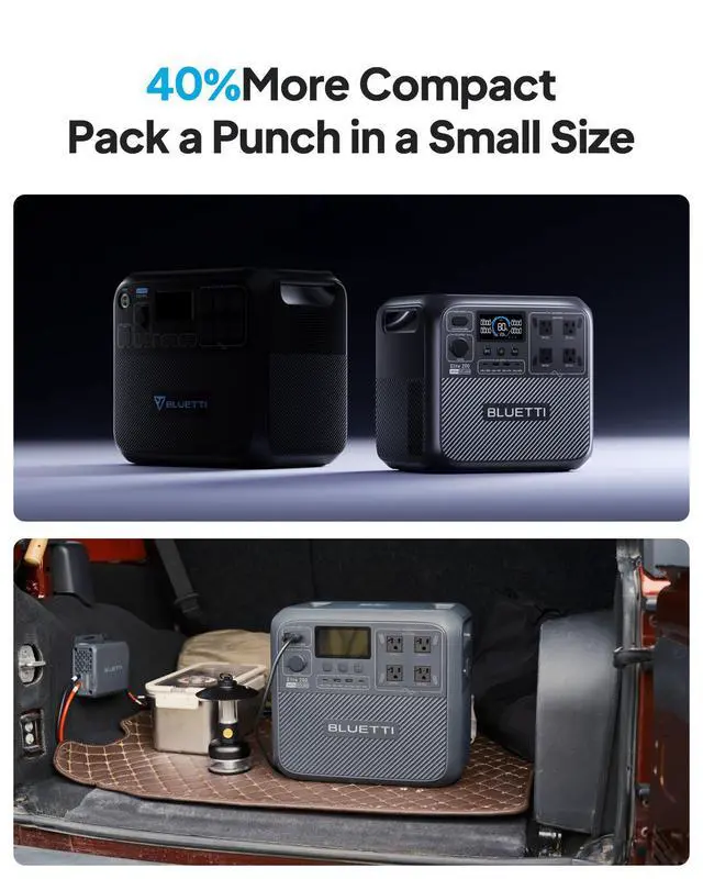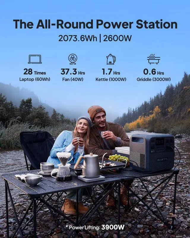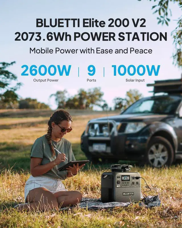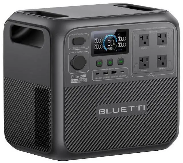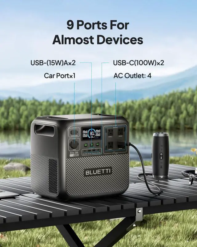 BLUETTI Elite 200 V2 Portable Power Station (2073.6Wh) is a high-capacity solar generator designed for camping, road trips, and home backup. With 2600W (5200W peak) AC output, it powers up to 9 devices simultaneously. Featuring a 17-year lifespan with durable LFP batteries, this power station supports over 6000 charge cycles. TurboBoost technology ensures fast chargingreach 80% charge in just 50 minutes. The upgraded app provides intuitive control and real-time power insights. The Elite 200 V2 is safe and reliable, with multi-layer protection and performance even in extreme temperatures.
