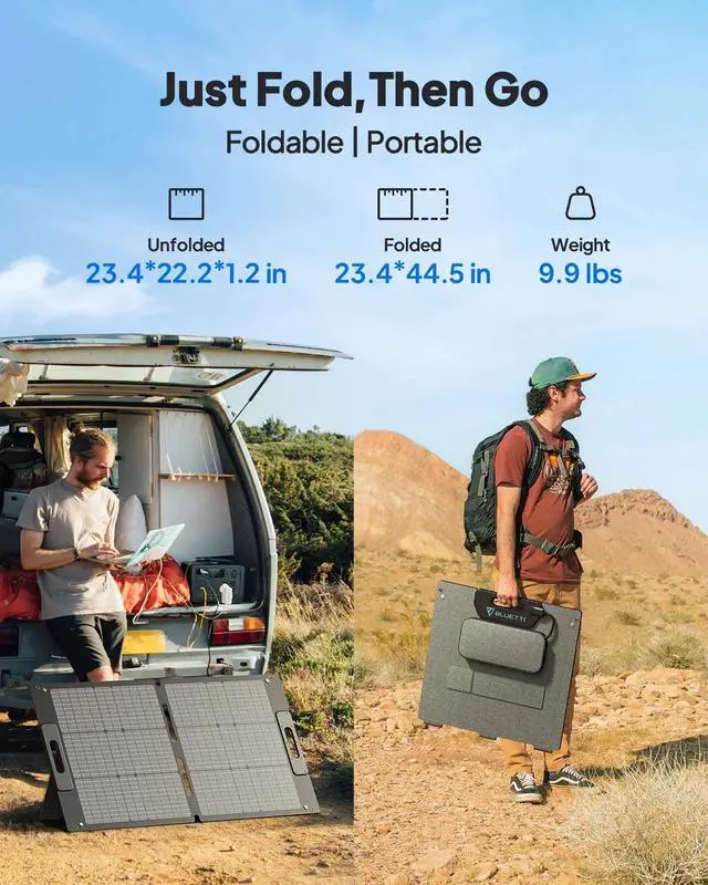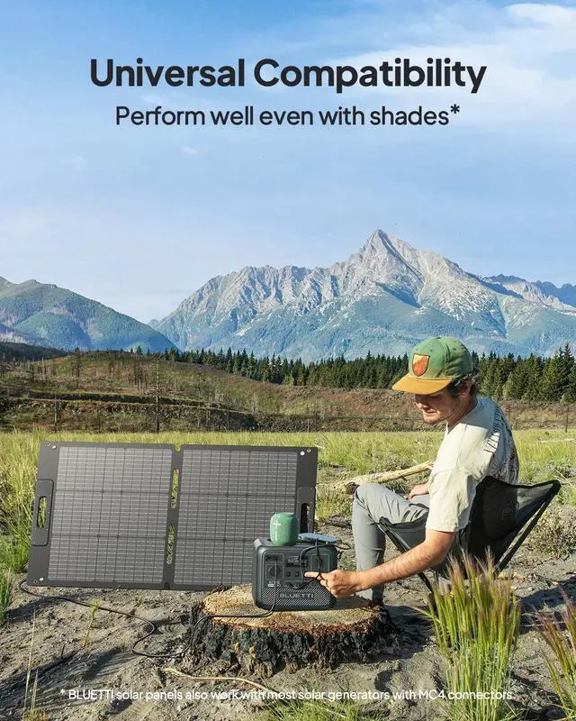 Power your devices anywhere with the BLUETTI 100W portable solar panel, compatible with solar generators like EB3A, AC50B, AC200L, and more. Built with high-efficiency monocrystalline cells, it converts up to 23.4% sunlight into electricity, even in cloudy conditions. Featuring a durable ETFE coating, this panel resists scratches and water, making it ideal for outdoor activities like camping and hiking. Its foldable design (23.4 x 22.2 inches, 10.9 lbs) ensures portability wherever you go.