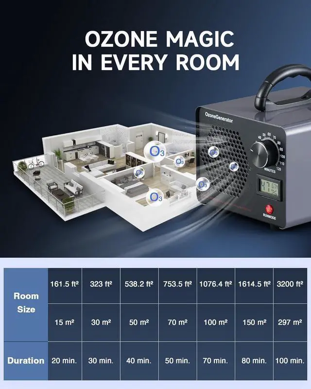 POWERFUL DEODORIZATION With a maximum ozone output of 35,000 mg/h and a 2800 rpm fan, this ozone machine can effortlessly deodorize a space of up to 3200 square feet