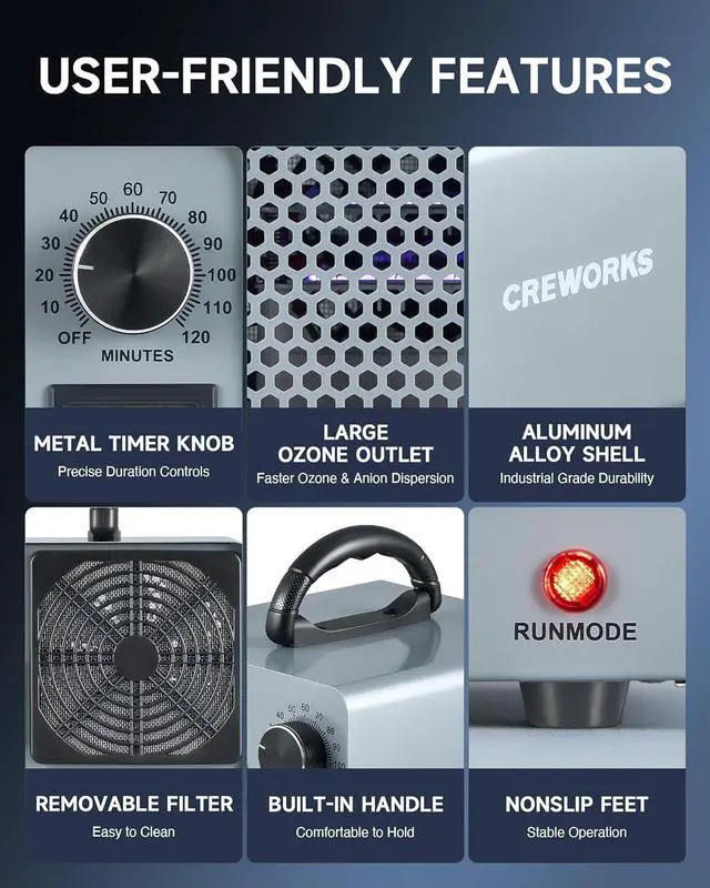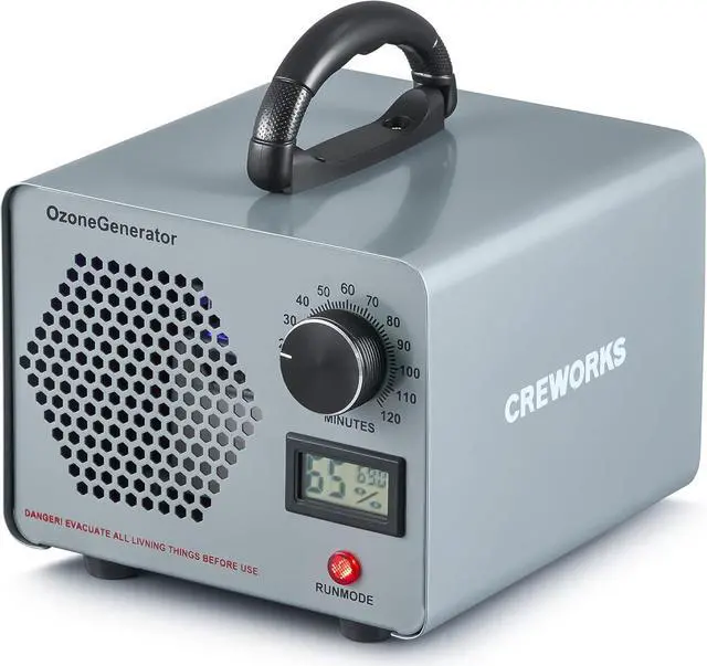 This Creworks ozone generator quickly produces a sufficient amount of O3 molecules to let them interact with various pollutants and airborne contaminants, eliminating tough odors at the source instead of masking them