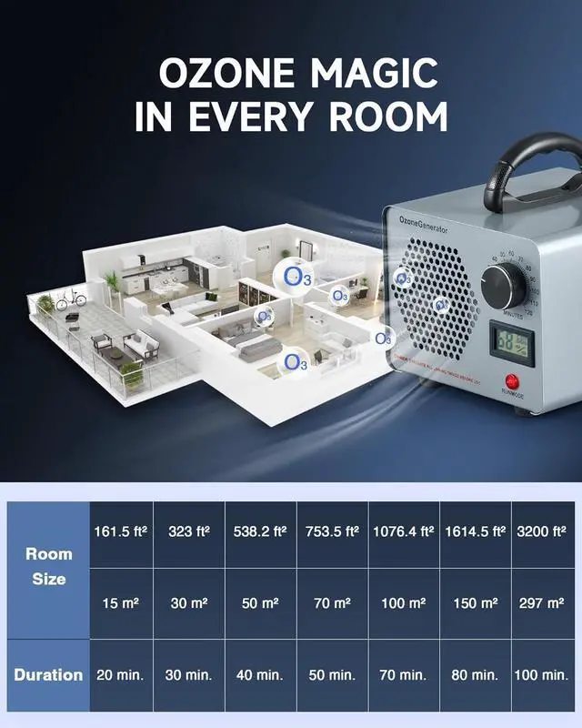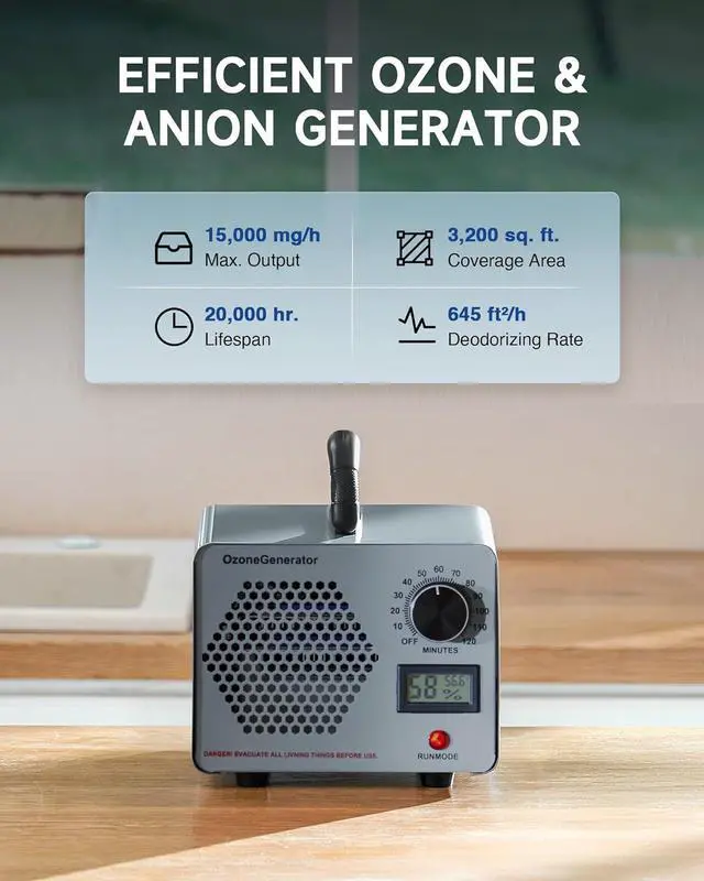 With a maximum ozone output of 15,000 mg/h and a 2800 rpm fan, this ozone machine can effortlessly deodorize a space of up to 3200 square feet