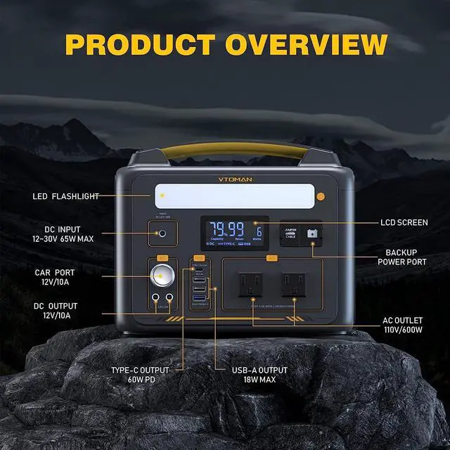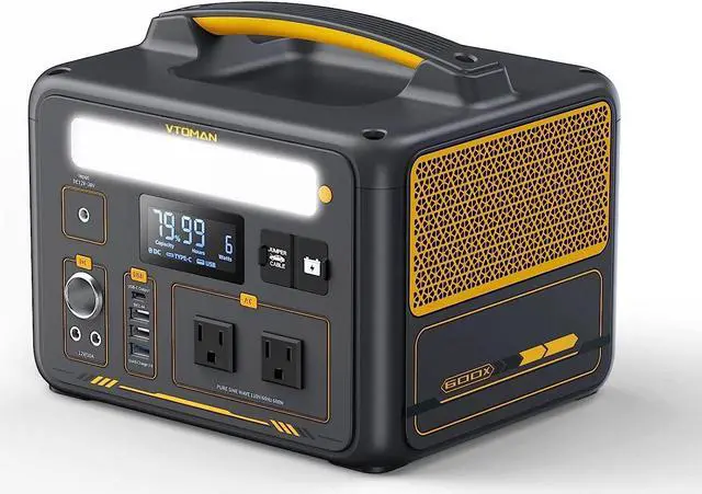 PD 60W Type-C OutputVTOMAN Jump 600X power station features multiple USB output ports, including 3* USB-A ports and 1* Type-C(USB-C) port. The Type-C port can provide a fast charge of 60 Watt Max for your electric devices, perfect for laptop office workers; the USB-A ports include a QC 3.0 fast charge port that can output 18W max, great for powering smart-phones, tablet, etc.